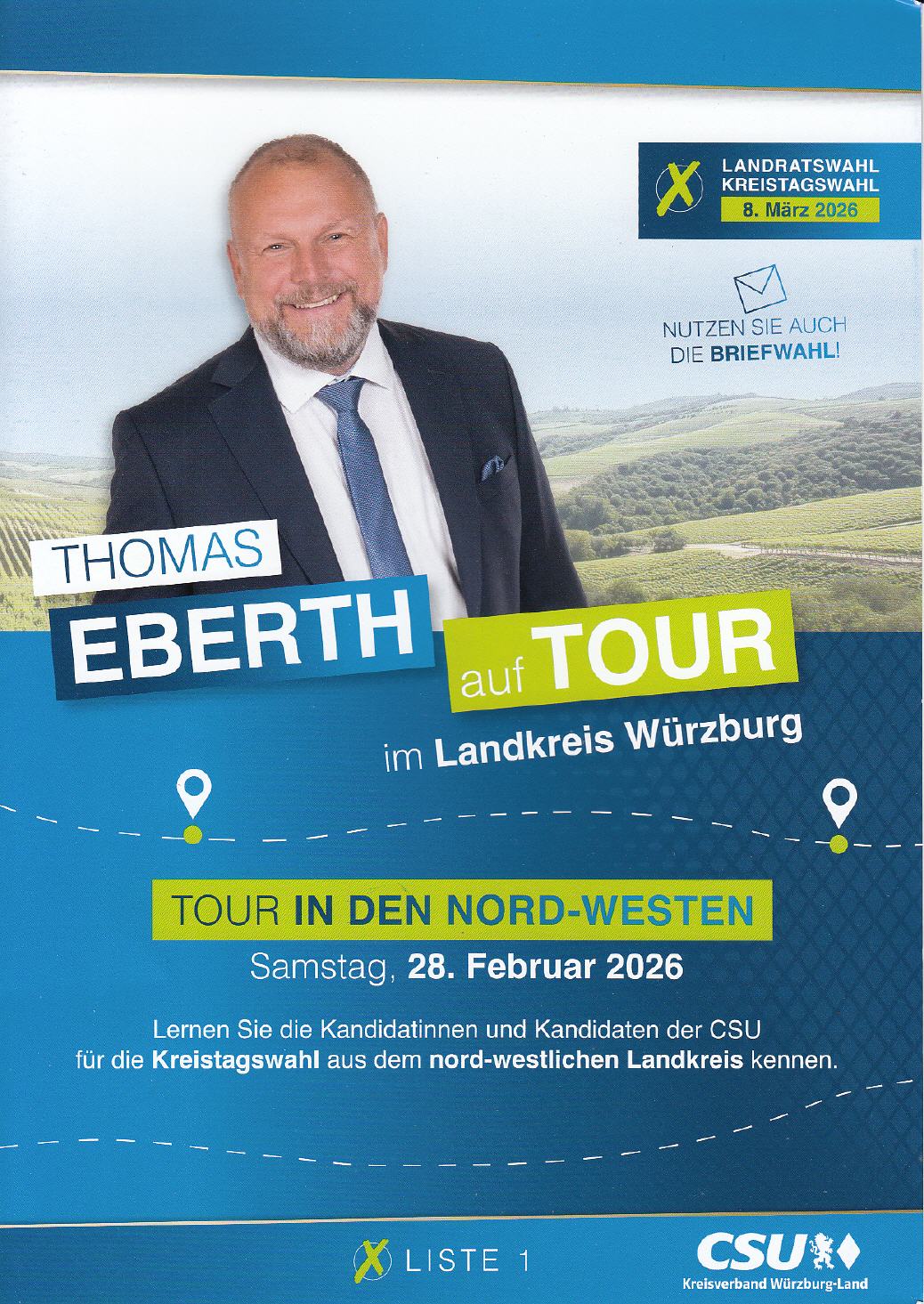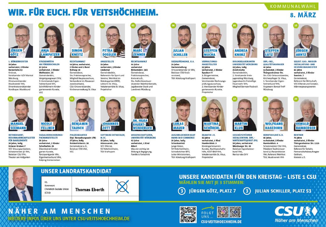 Gemeinsam mit Kandidatinnen und Kandidaten der CSU für die Kreistagswahl kommt Landrat Thomas Eberth im Rahmen der Landkreistour auch in Veitshöchheim vorbei.
